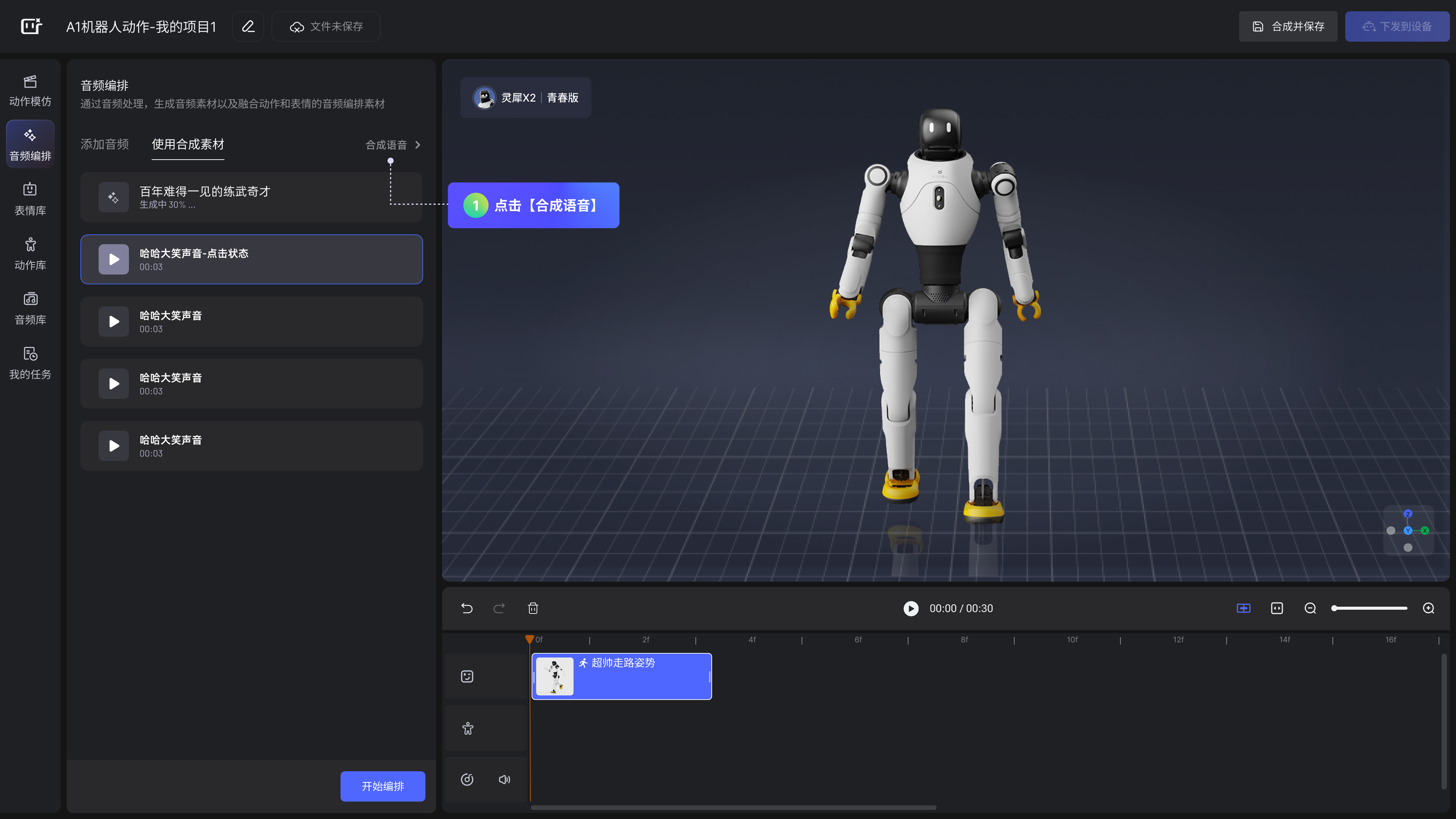 在「选择机型」弹窗点击【确认】按钮后,即可进入「创作主页面」,从零开始构建机器人演绎内容。可自由编排音频、动作与表情,进行个性化创作。